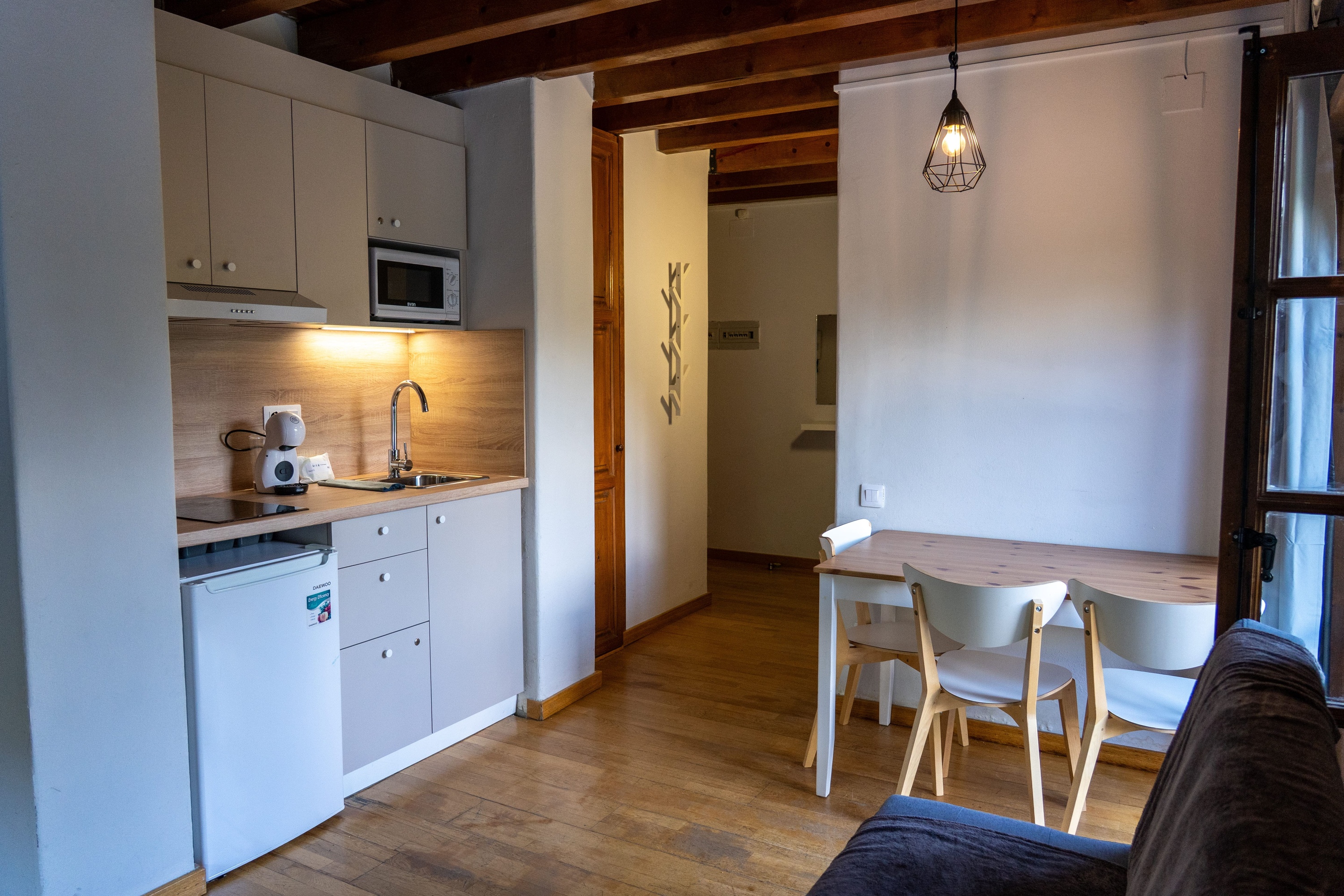 The common area on the lower floor has a living-dining room, kitchenette, TV, a double trundle-type sofa bed and heating. It also has two double rooms, with two single beds each, or a room with two single beds and another with a bunk bed. On the upper floor two single beds, a bathroom and heating. Pets are allowed (for more information see the services section of the website).